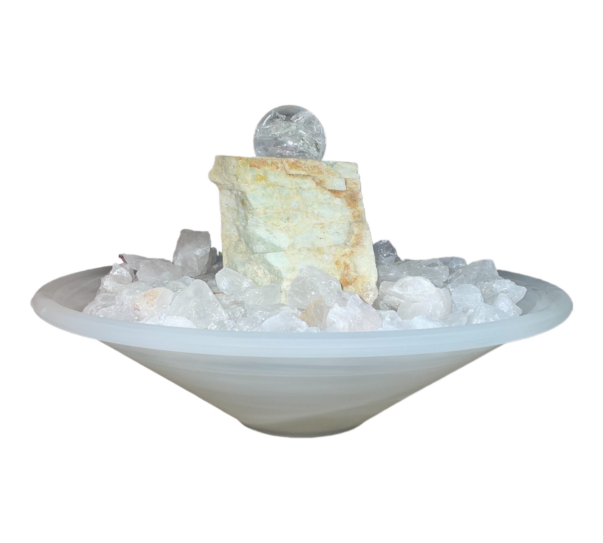 Þessi fallegi eiginleiki er fullkomin viðbót við hvaða zen umhverfi sem er, þar sem Aquamarinsteininn og bergkristalsteinarnir gefa róandi glampa.